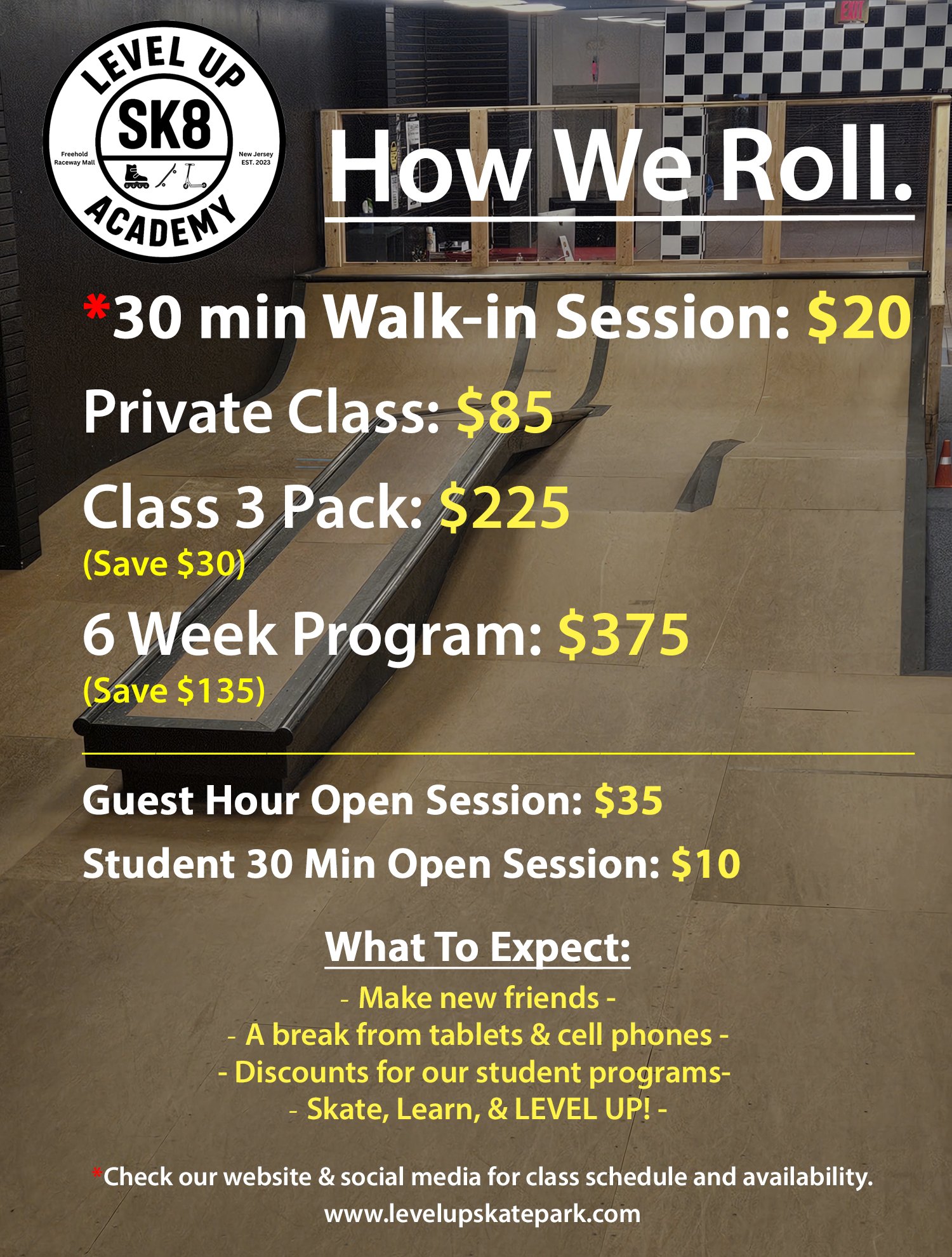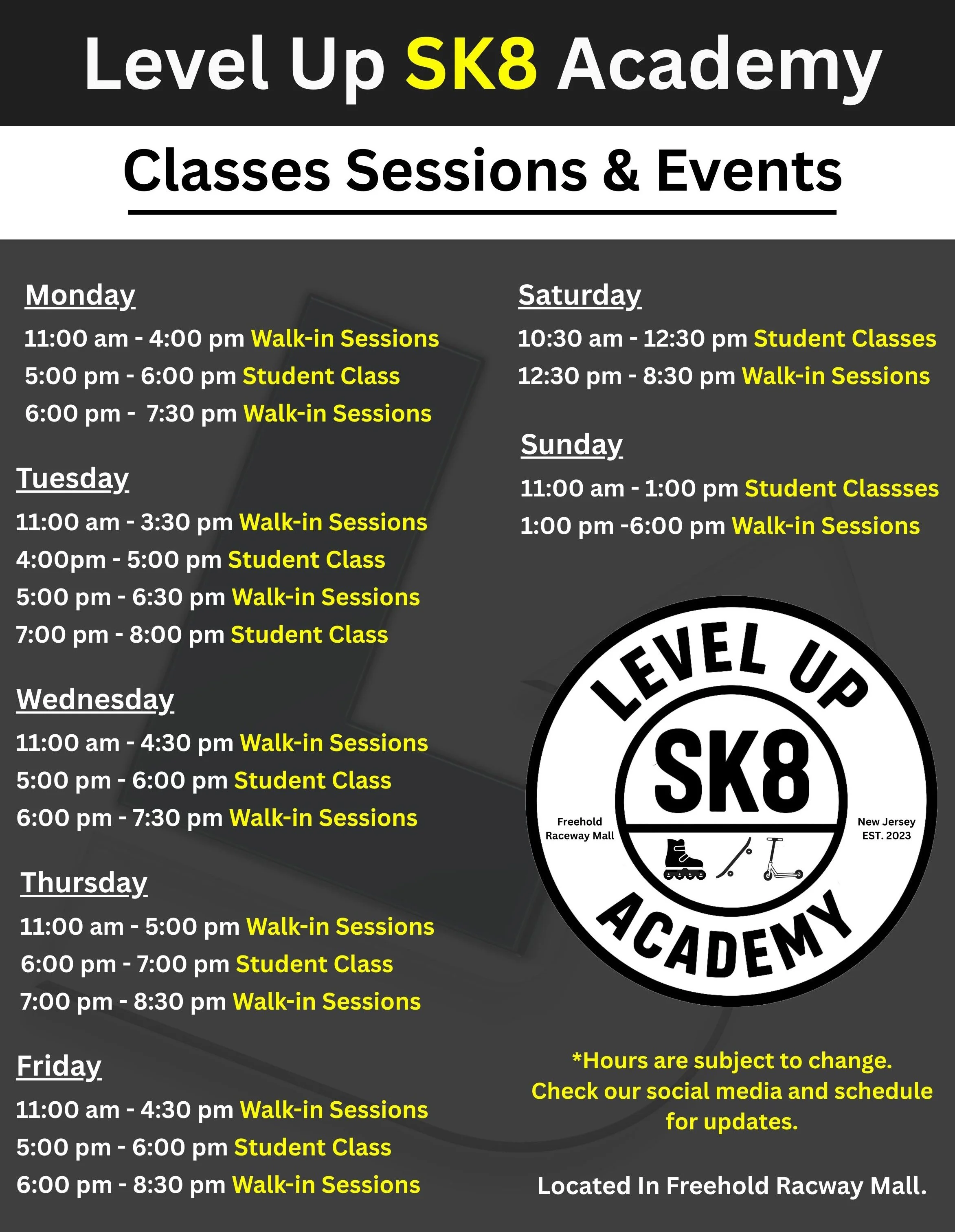 ****NOTICE: Level up skatepark is NOW, The Level Up Academy. Open Sessions are for our students and walk-ins. Open skate sessions will be based on class times and space availability. Make sure to book on-line to secure your session time. Thank YOU - Staff