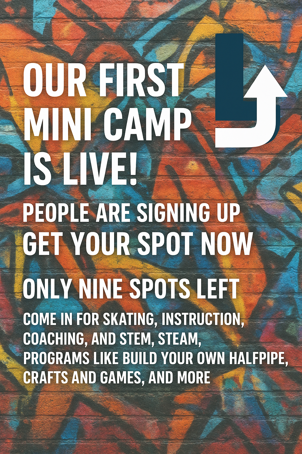 3 days ( 3 hours a day) of open skate, coaching, crafts and other activities to help improve your skatepark skills. Don't miss this opportunity to level up your skating this season! Camps are from 11am to 2pm and include a pizza party on Fridays!!